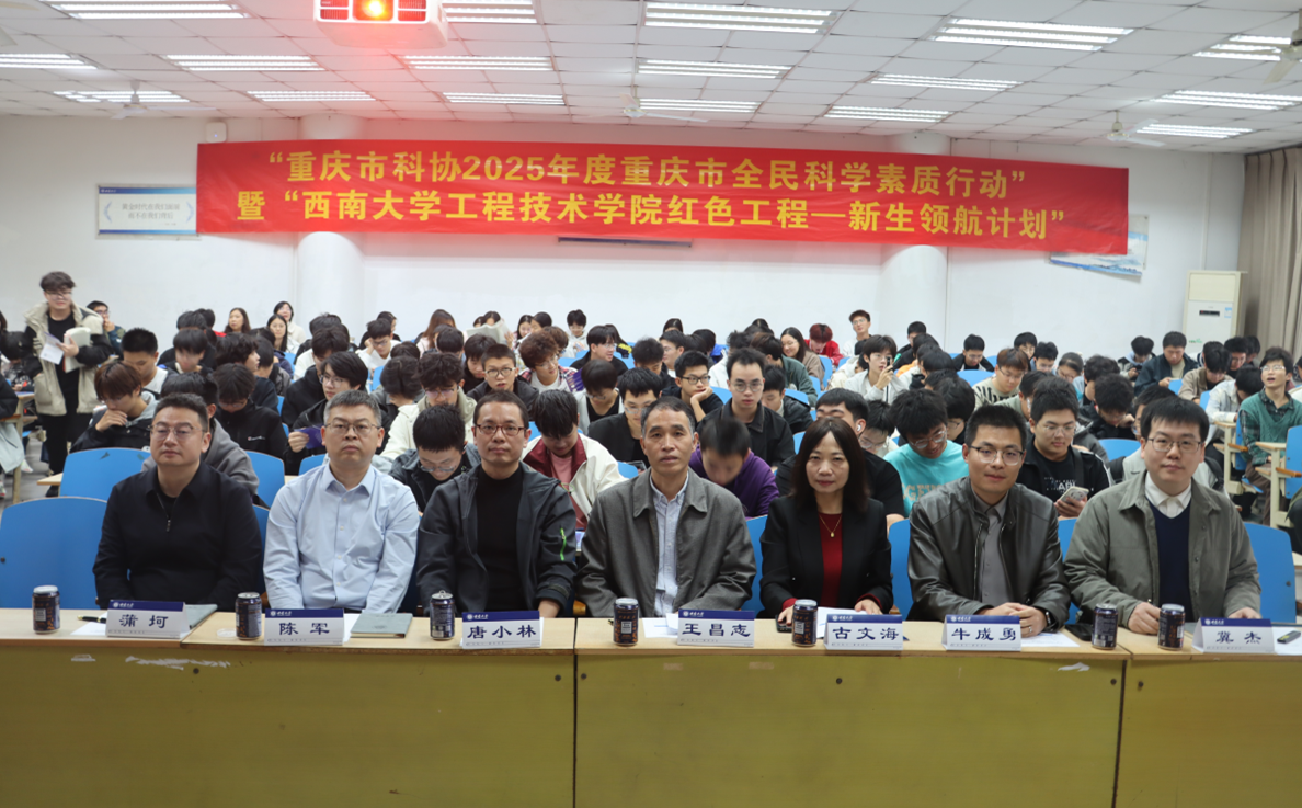 11月7日下午,西南大学工程技术学院“红色工程-新生领航计划”暨“重庆市科协2025年度重庆市全民科学素质行动”专题科普讲座在西南大学成功举办。本次活动由重庆市科学技术协会主办,重庆汽车工程学会、《汽车工程学报》编辑部、西南大学工程技术学院联合承办,重庆市科协科普部一级调研员王昌志、西南大学工程技术学院党委书记古文海、重庆大学教授唐小林、招商车研前瞻技术室主任牛成勇、《汽车工程学报》研究员级高工陈军出席活动,工程技术学院2025级本科生、研究生约500人通过线上线下方式参加活动,西南大学工程技术学院农机与车辆教工党支部书记冀杰主持活动。