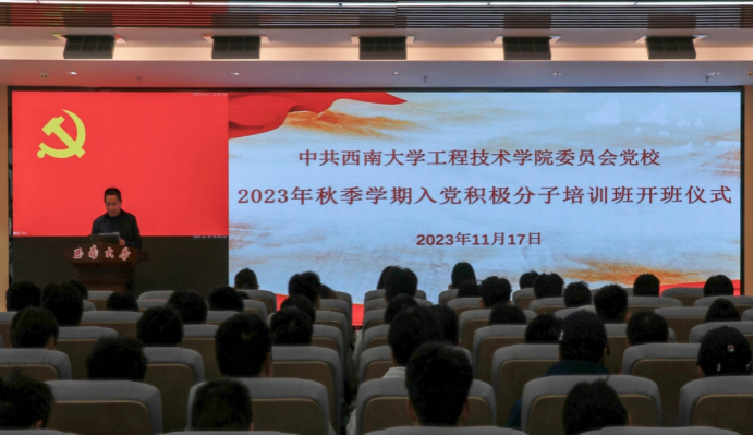2023年11月17日下午,工程技术学院党委分党校在工科大楼A座511会议室举行2023年秋季学期入党积极分子培训班开班典礼。学院党委书记、党校校长古文海,学院党委副书记纪委书记、党校副校长陈富国,学院专职组织员于伊娜,党校班主任邓兰香,2023级辅导员吴祥均及200余名入党积极分子学员参加。开班仪式由学院党委副书记陈富国主持。