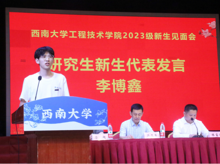 2023级农业机械化工程专业硕士研究生李博鑫作为研究生新生代表发言,他以“向下扎根,向上生长”为题讲述了自己本科就读和考研的经历,向全体2023级新生发出倡议:坚定理想信念、练就过硬本领、积蓄发展后劲,珍惜韶华,不负生活,不负自己!