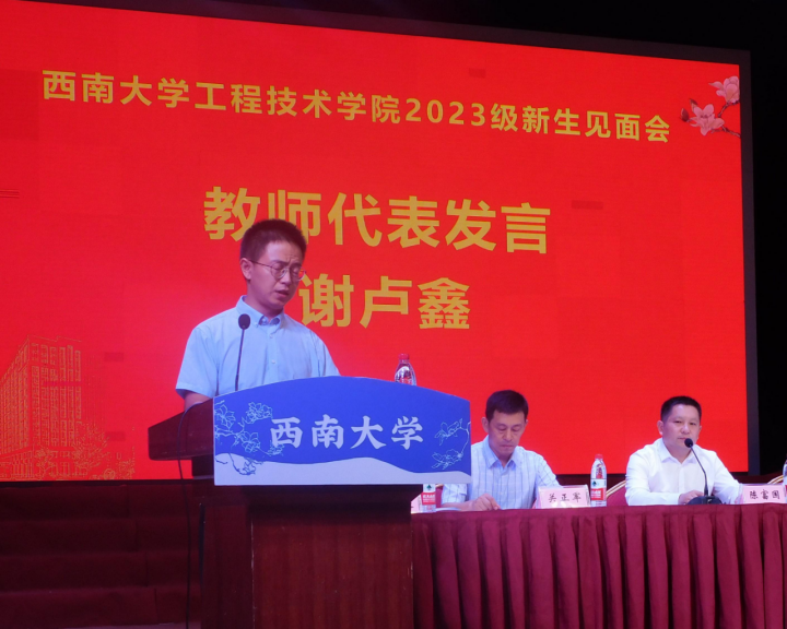 谢卢鑫老师作为教师代表发言,他以“我们为什么要上大学”为题启发并建议同学们应学会沉下心来,认识自己;学会定下心来,做好自己;学会尊重和感恩他人,在大学中强健体魄、砥砺意志、挥洒激情、探索真知。