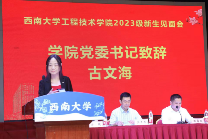 学院党委书记古文海致辞,她代表全院师生员工对新生们表示欢迎和祝贺,为新生们简要介绍了学院情况,寄语同学们胸怀祖国、志存高远,刻苦学习、奋发有为,多方锤炼、全面发展,不负时光,努力成为德智体美劳全面发展的“新工科”一流人才。