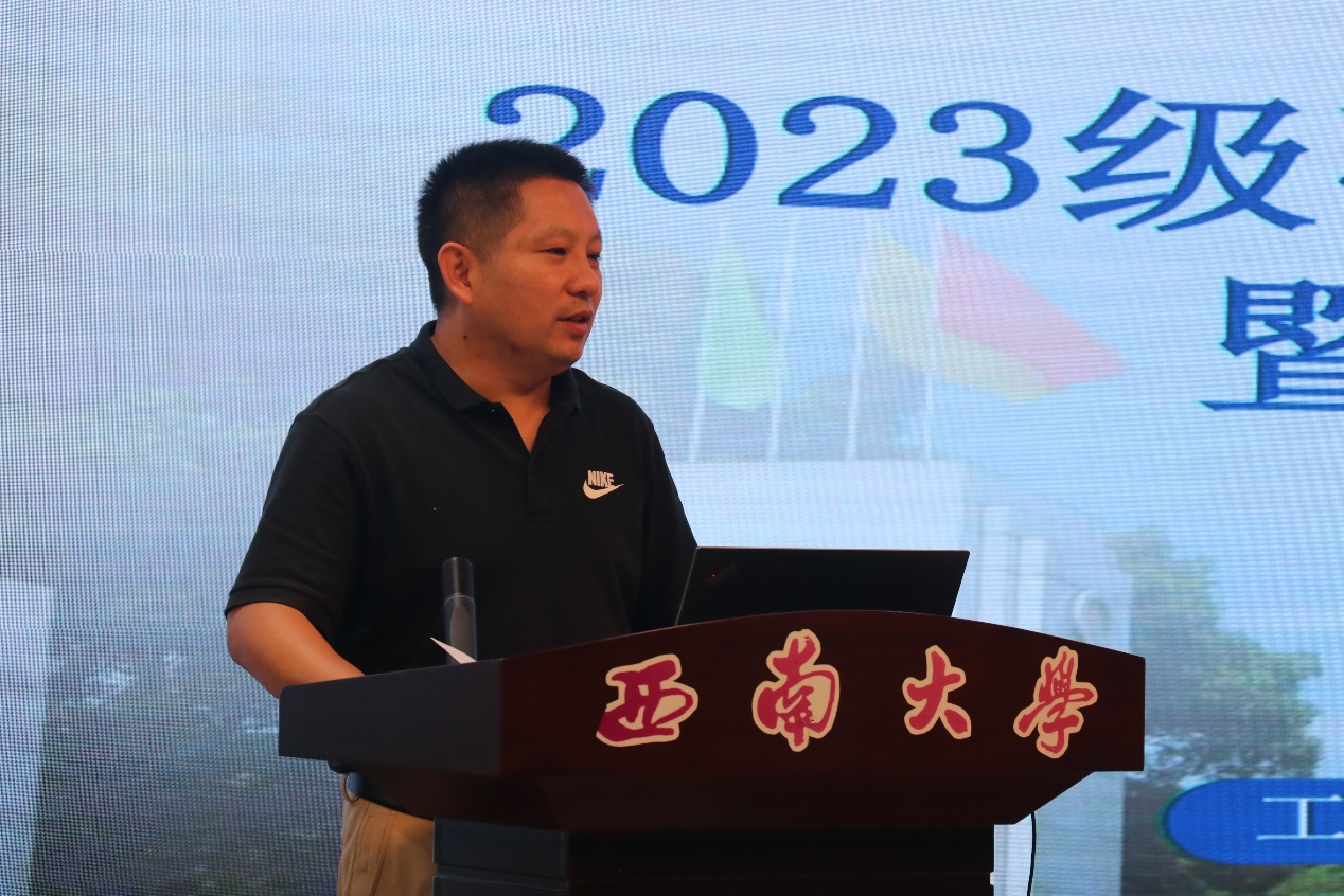 首先,谢守勇院长致辞并向同学们介绍了学院整体情况。谢守勇院长对同学们的到来表示热烈欢迎。他从学院概况、人才现状、学科发展以及人才培养等方面进行了细致的讲解,让同学们对学院有了更深的认同感和归属感。他对同学们提出了几点希望:一是要坚定理想信念,立鸿鹄之志;二是要遵守学术道德行为规范,潜心科研、勇攀高峰;三是要全面发展,继承和发扬以爱国主义为底色的科学家精神。