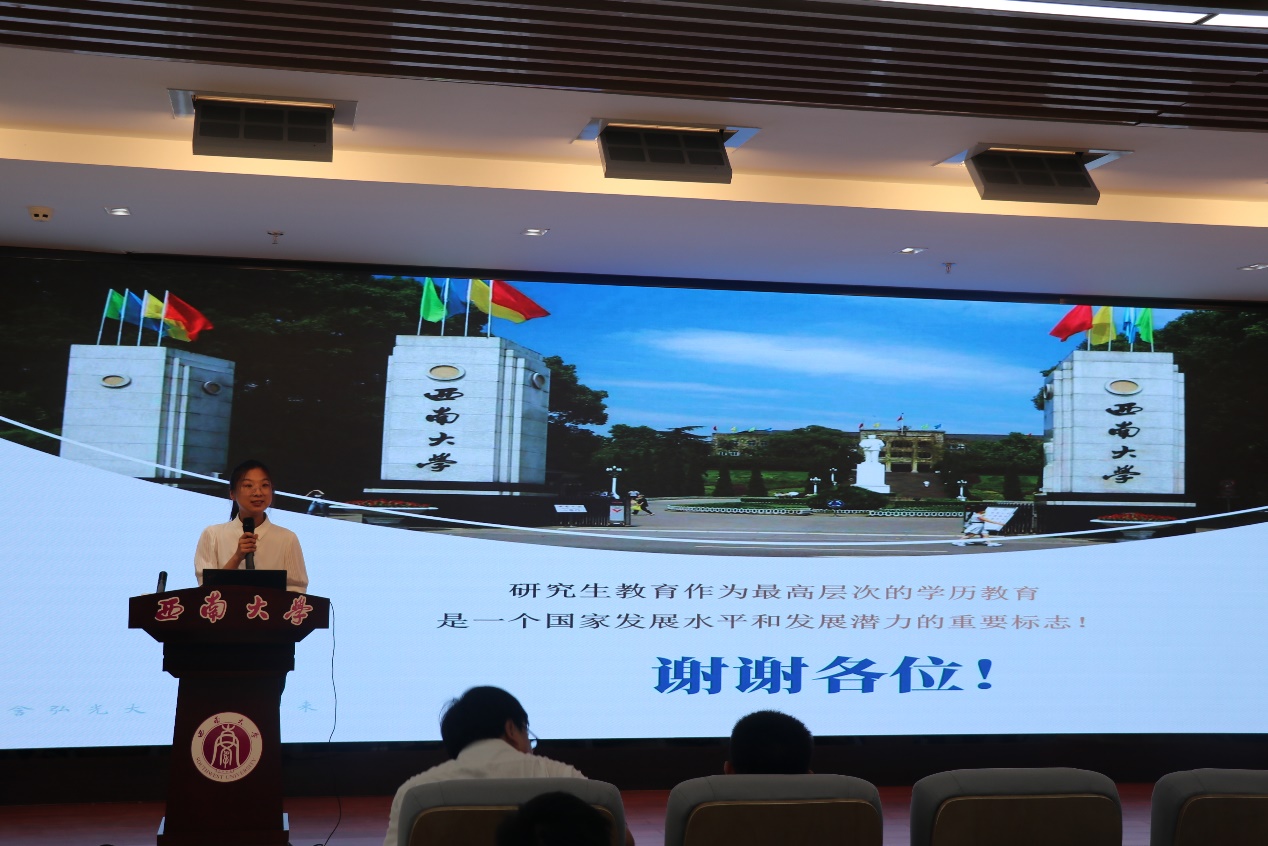 最后,彭敏杰老师给新生进行思想政治教育并作日常管理文件导读,着重强调了家国情怀、安全意识和心理健康。此外,彭老师通过讲解评奖评优、综合测评和学校学生管理规定等相关文件,对研究生的行为规范、日常管理提出要求。她希望同学们严守学术道德、遵守学校规章制度,做好研究生生涯规划,让自己的研究生生活不留遗憾。