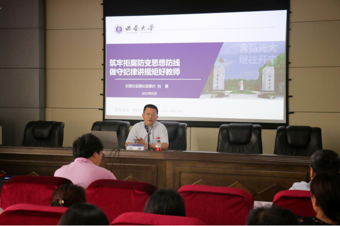 6月2日下午,学院党委召开2023年师德师风专题教育培训会,邀请学校纪委副书记、党委巡察办主任刘勇作专题报告,以学习贯彻习近平新时代中国特色社会主义思想主题教育为契机,大力推进师德师风建设,学院党委书记古文海主持会议,全体教职工参会。