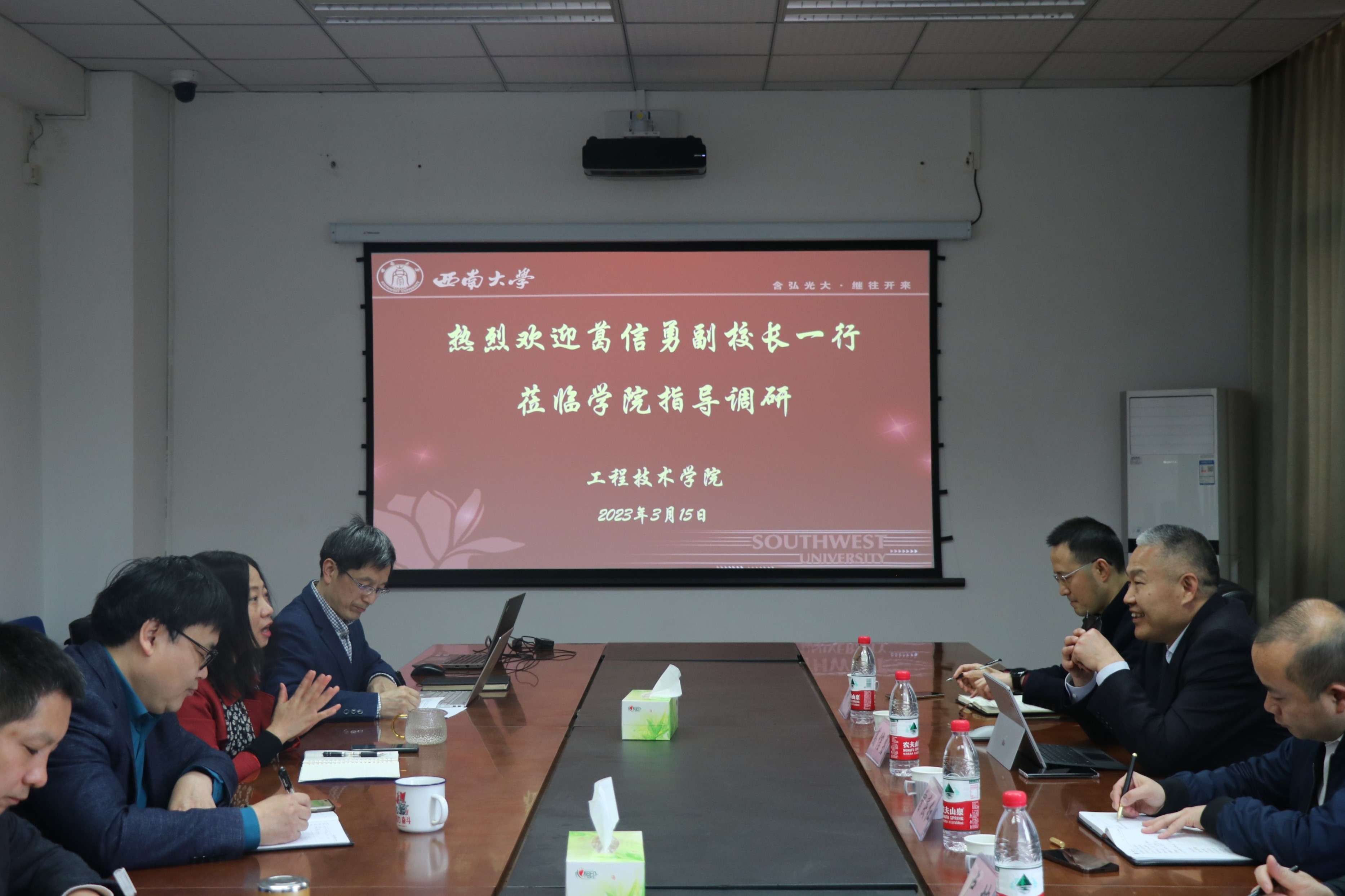 学院党委书记古文海首先代表学院对葛信勇副校长及各部门负责人一行的到来表示热烈的欢迎。随后,古文海书记、谢守勇院长就学院目前重点工作任务—工程训练中心建设和西南大学智慧农业学院建设的工作思路和进展进行了详细汇报,参加调研的学校职能部门领导同志也针对性地提出了建议。