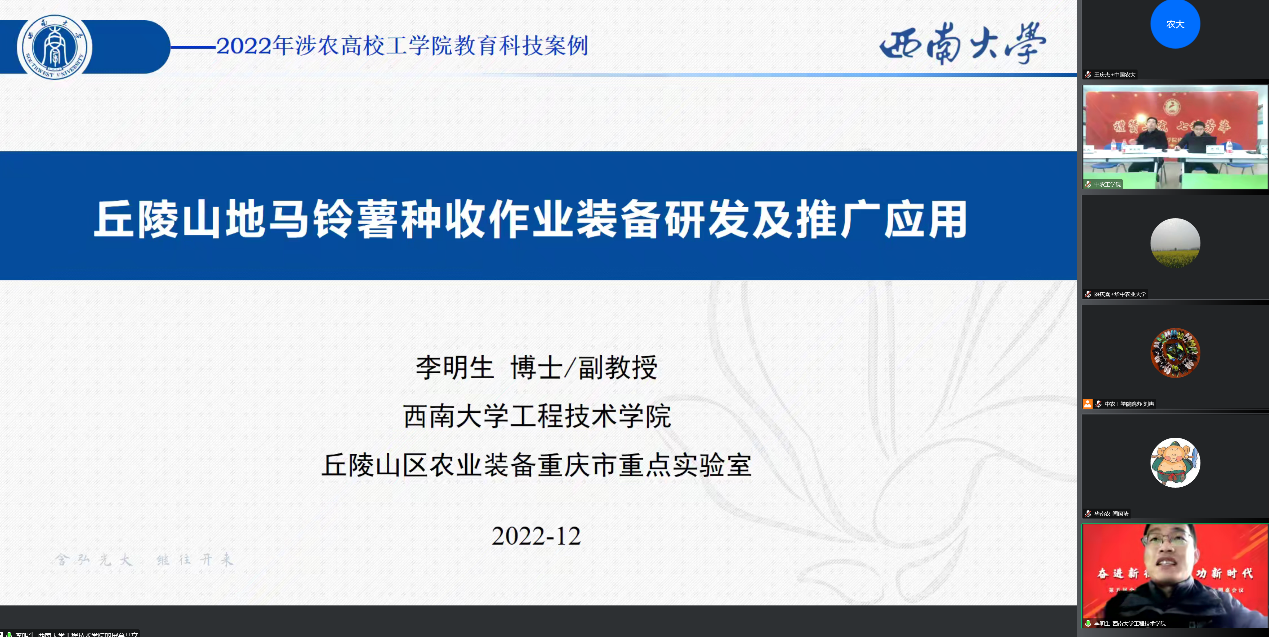 会议以线上的方式开展,我院李明生副教授就《丘陵山地马铃薯种收作业装备研发及推广应用》案例作报告,介绍了丘陵山地马铃薯生产机械化现状以及需求,分享了我院在该领域取得的成果和成效。