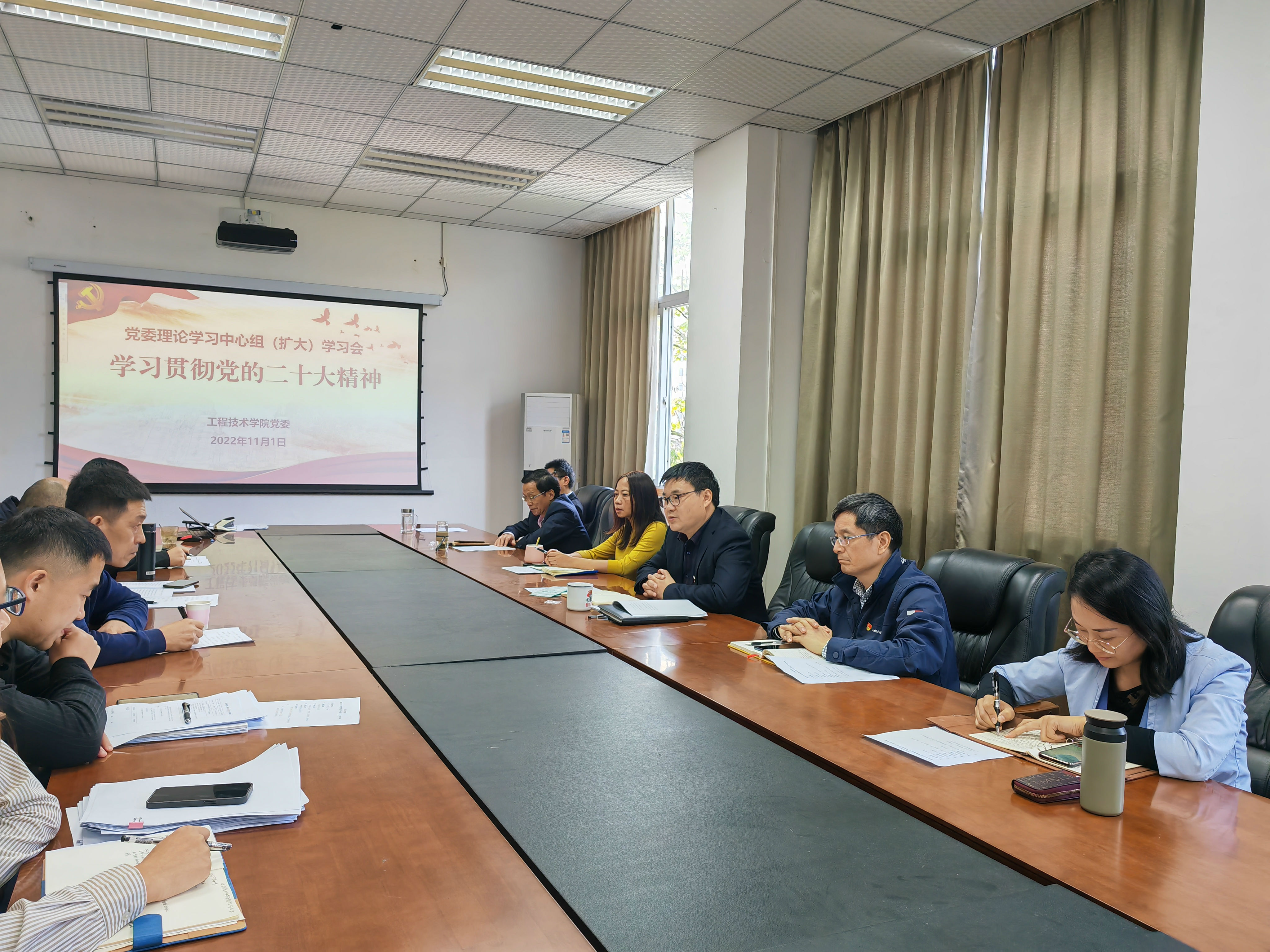 2022年11月1日上午,学院党委在文俊楼514会议室召开理论学习中心组(扩大)学习会,围绕“学习贯彻党的二十大精神”进行专题研讨,学院党委书记古文海主持,全体中心组成员、党委委员、纪委委员、支部书记参会。