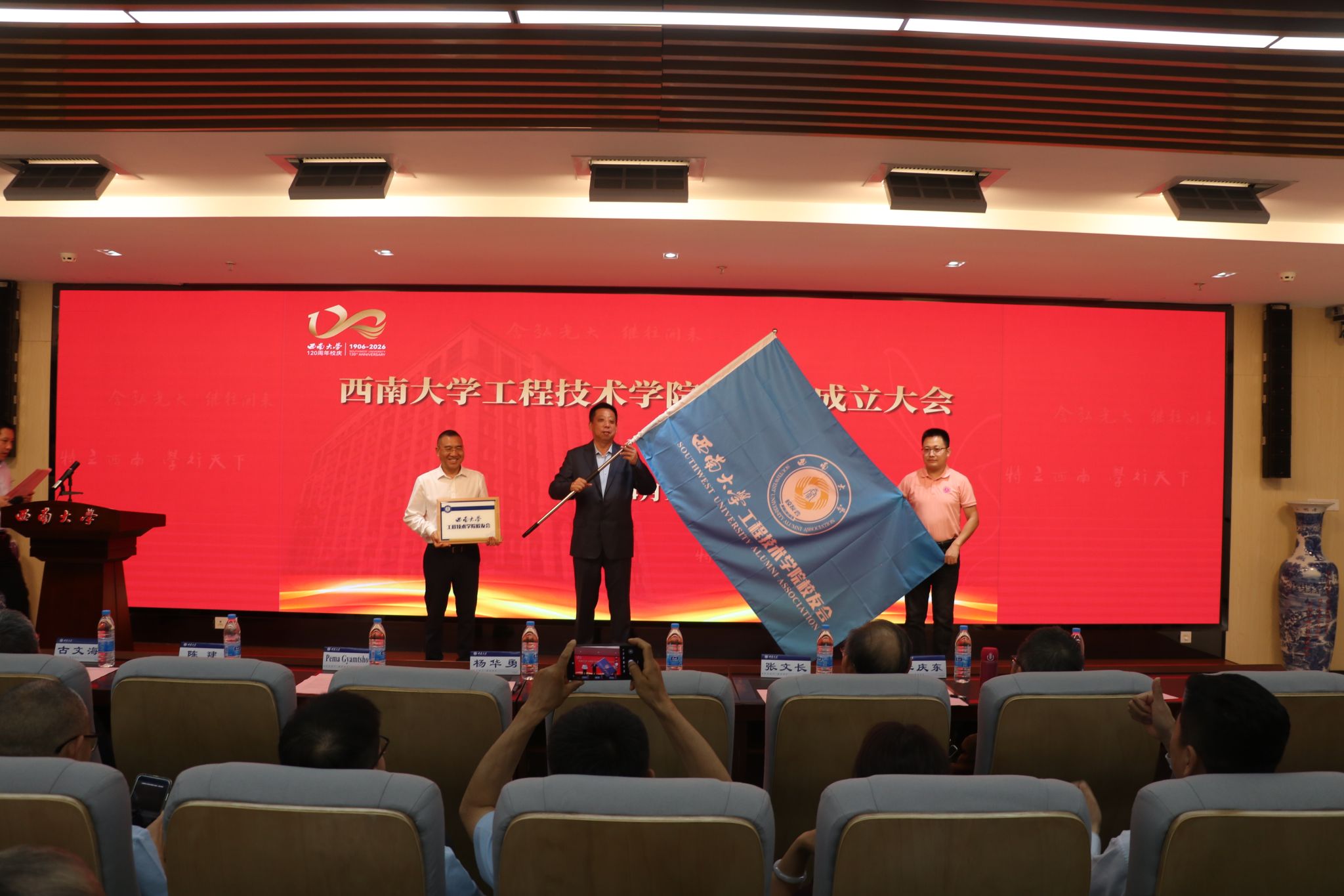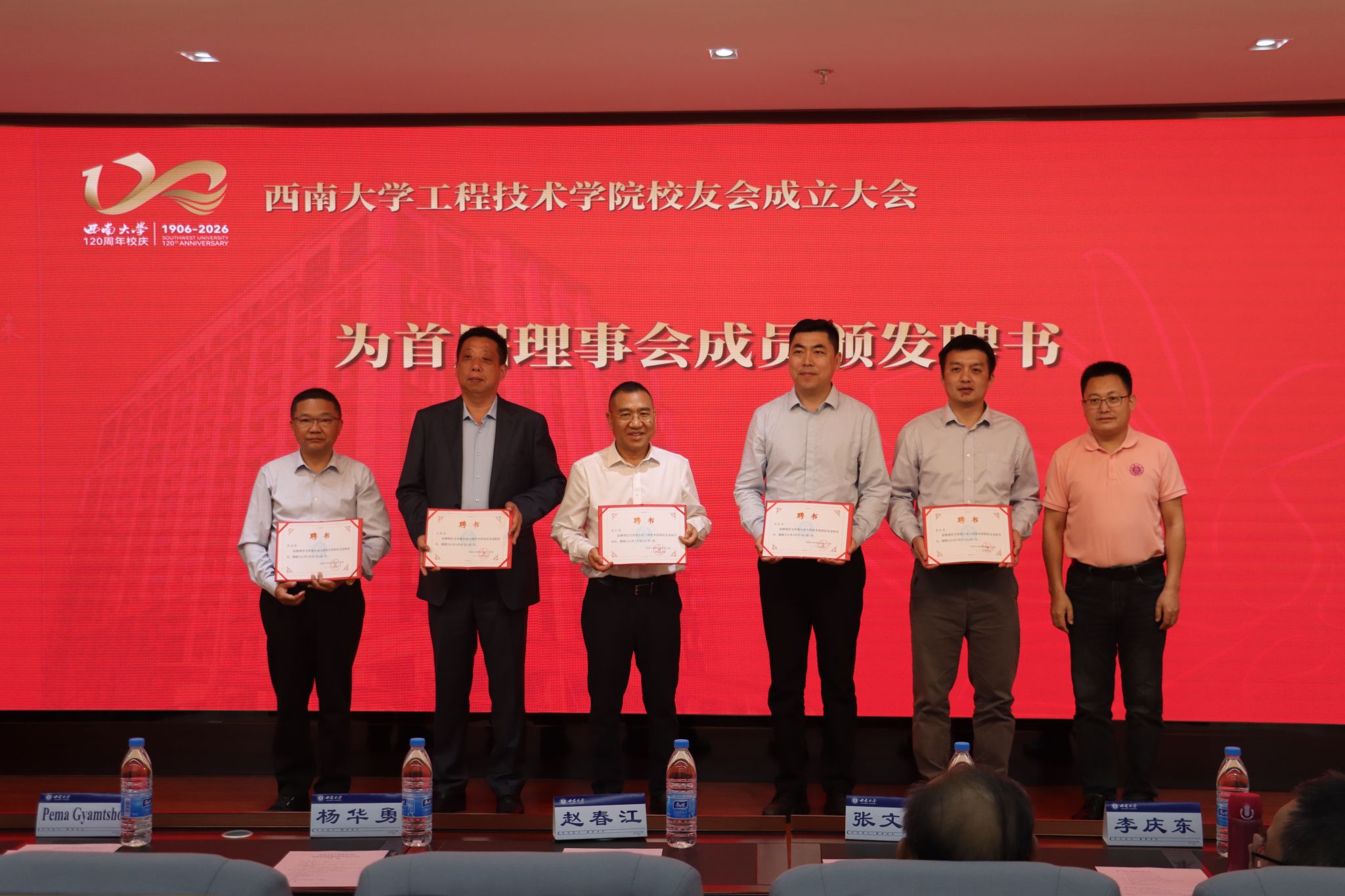 随后,大会进入校友会成立阶段。学校对外联络办校友联络科科长谷剑飞宣读《关于同意筹备成立西南大学工程技术学院校友会的批复》。大会审议通过首届组织机构提名名单,为首届理事会成员颁发聘书,并为校友会授牌、授旗。