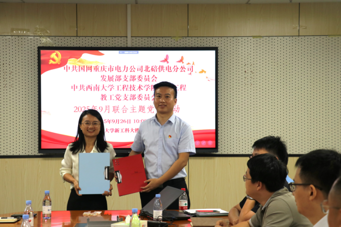 为推动党建工作与事业发展深度融合,2025年9月26日上午,学院电气工程教工党支部与国网重庆北碚供电公司发展策划部党支部开展联合主题党日活动,并举行了结对共建签约仪式。北碚公司副总经理卢化、学院副院长周渠及双方党员共30余人参加。电气工程教工党支部书记胡剑主持活动。